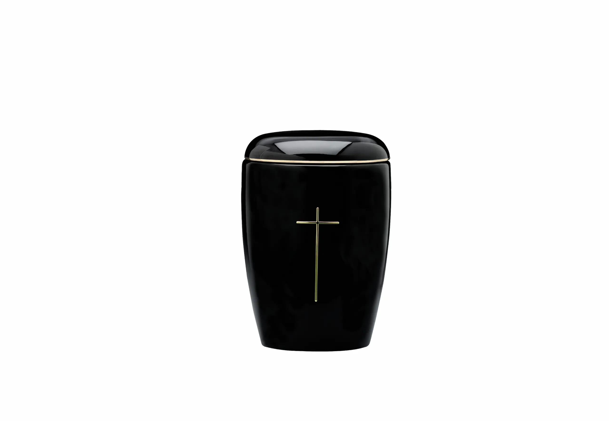 En vacker och hållbar urna i glaserad keramik, särskilt utformad för placering i urnmur eller kolumbarium. Urnan är dekorerad med ett guldband och ett kors – symboler för evighet, tro och minne. Den silkesmatta glasyren ger ett lugnt och värdigt uttryck, oavsett om du väljer svart eller vit finish, och kan anpassas med personlig gravyr.