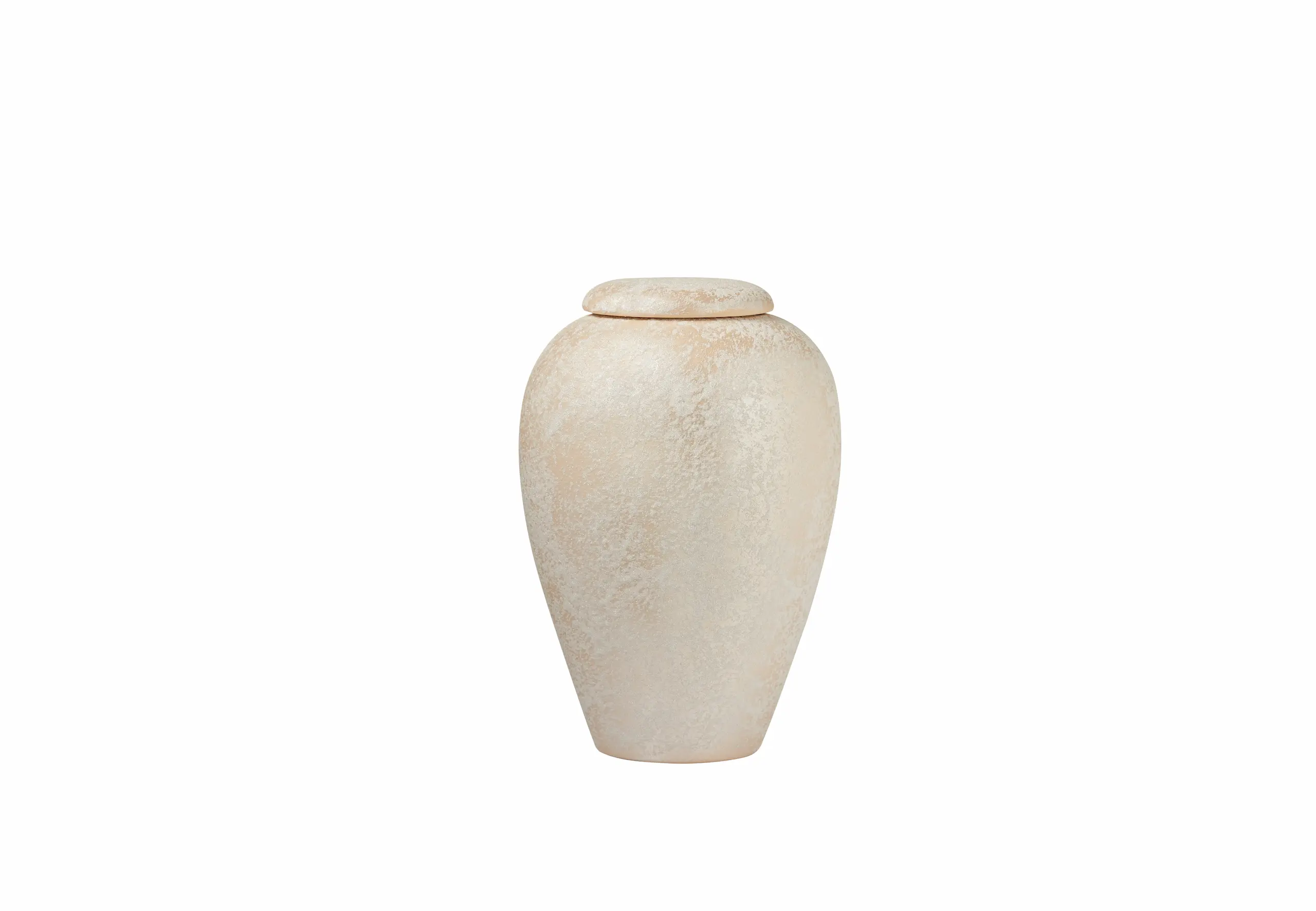 Urnan Venecia är inspirerad av marina organiska former och tillverkad av rå lera – ren jord som färgats enbart med naturliga pigment. Ytan är behandlad med bivax, vilket framhäver materialets naturliga skönhet och ger en mjuk lyster.